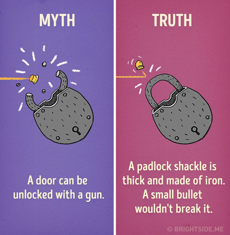 Όλες οι κλειδαριές ανοίγουν με έναν πυροβολισμό. Ούτε κι αυτό ισχύει, αφού τα λουκέτα φτιάχνονται από παχύ σίδερο και μια μικρή σφαίρα ούτε που θα τα γρατζουνούσε.