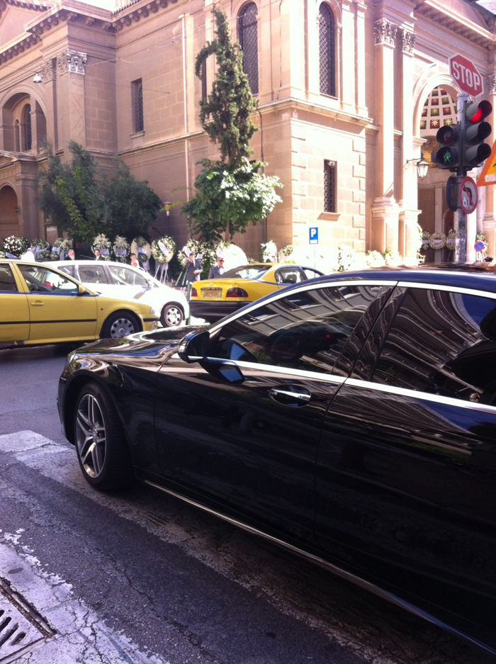 Καθώς κατεβαίνω από τη Δημοκρίτου για να στρίψω στη Σκουφά, με παρασύρει σαν τσουνάμι μια θάλασσα λευκών λουλουδιών περασμένων σε στεφάνια πένθιμα, στοιβαγμένα περιμετρικά του ναού, σε κάθε τετραγωνική ίντσα που μπορούσε να πιάσει το μάτι σου. Τα στεφάνια δεν ήταν απλά τοποθετημένα το ένα δίπλα στο άλλο, αλλά και το ένα πάνω στο άλλο, συχνά σε αρκετές στρώσεις. Υπήρχε όμως μια μαεστρία στην τοποθέτηση: Όσο παχιές κι αν ήταν οι στρώσεις, εσύ ο άγνωστος περαστικός μπορούσες να διαβάσεις καθαρά τα ονόματα των αποστολέων τα γραμμένα με χρυσοποίκιλτες γραμματοσειρές πάνω στις σατέν κορδέλες.