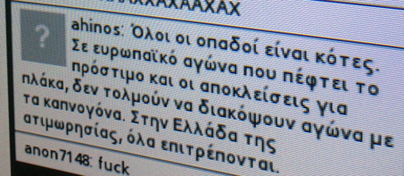 Ο αγώνας της Κυριακής μεταξύ Ολυμπιακού και ΠΑΟΚ είναι φυσικά κάτι περισσότερο από ένας αγώνας ποδοσφαίρου. Οι φίλαθλοι βρίσκουν ευκαιρία να βρίσουν πέραν των συνηθισμένων -ομάδα, μάνα, ξαδέρφη, αδερφή, κτλ κτλ- και την πόλη που εκπροσωπεί η ομάδα. Ίσως για αυτό τα tweets και οι διάλογοι στα chat των φιλάθλων να έχουν λίγο περισσότερο ενδιαφέρον από άλλες φορές. Χτες λοιπόν, κατά τη διάρκεια του live streaming του αγώνα και ενώ η εικόνα κόλλαγε σε ενοχλητικό βαθμό, το μάτι μας έπεσε στους διαλόγους στο chat ακριβώς δίπλα. Και δυσκολεύτηκε να ξεκολλήσει. Για ακόμα μια φορά οι φανατικοί οπαδοί ανεξαρτήτως ηλικίας και μορφωτικού επιπέδου έδωσαν ρέστα και εμείς ξεχωρίσαμε 26 από τα επικά τους σχόλια.