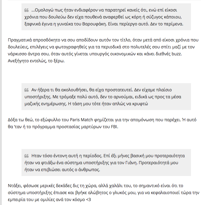 Η σύζυγος του τέως υπουργού Οικονομικών σχολίασε σε ανθρώπινο τόνο την αμηχανία που της προκάλεσε η αλλαγή στην οικογενειακή τους ζωή – κάτι για το οποίο δεν μας πέφτει, ιδιαίτερα, λόγος.