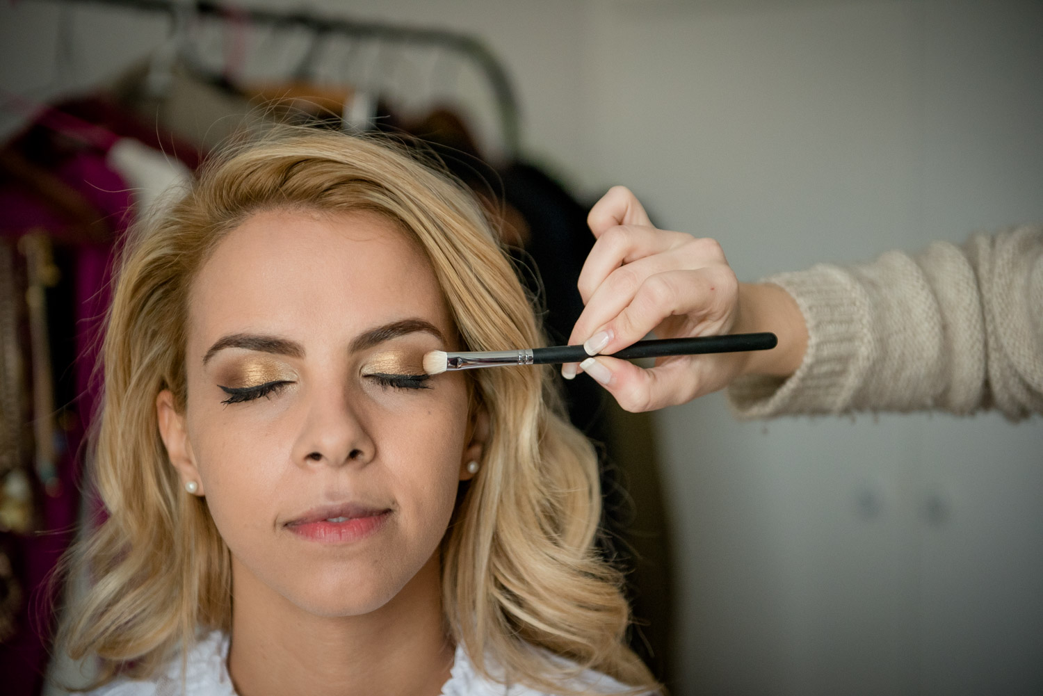Με 3 σκιές έχουμε ξεμπερδέψει. Μία σκούρα καφέ για την εξωτερική γωνία και το κόκκαλο του ματιού, μία χρυσή για το κινητό βλέφαρο και μία αρκετά φωτεινή για το τόξο του φρυδιού και την εσωτερική γωνία του ματιού. Ξεκινάμε, λοιπόν, με τη σκουρόχρωμη για την εξωτερική γωνία για να δώσουμε βάθος και ένταση στο βλέμμα. Συνεχίζουμε με τη χρυσή σκιά στο κινητό βλέφαρο, διαβαθμίζοντας καλά με το πινέλο και ολοκληρώνουμε με τη φωτεινή σκιά κάτω από το φρύδι και στην εσωτερική γωνία του ματιού.