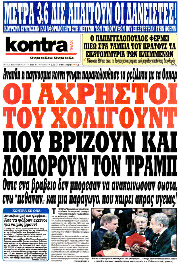 Κάπως έτσι «άναυδη η κοινή γνώμη παρακολούθησε τα ρεζιλίκια με τα Όσκαρ» και «Οι άχρηστοι του Χόλιγουντ που βρίζουν και λοιδορούν τον Τραμπ, ούτε ένα βραβείο δεν μπόρεσαν να ανακοινώσουν σωστά, ενώ "πέθαναν" και μια παραγωγό που χαίρει άκρας υγείας» ήταν το χαρακτηριστικό πρωτοσέλιδο της εφημερίδας.