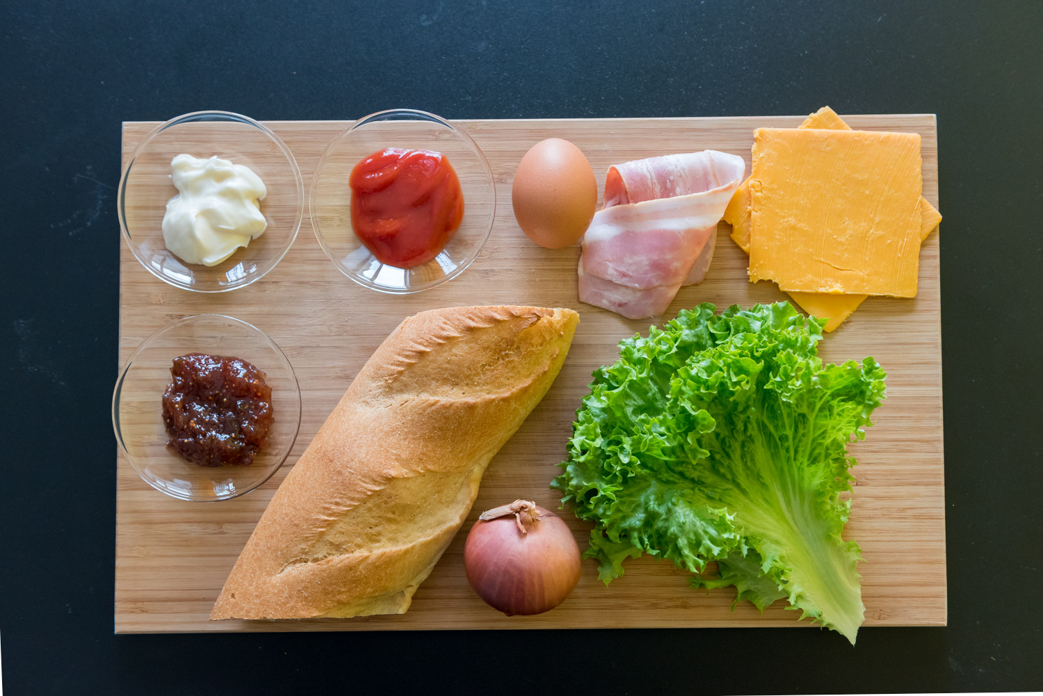 Στο τηγάνι μας σοτάρουμε το κρεμμύδι κομμένο σε δαχτυλίδια μέχρι να καραμελώσει. Βγάζουμε το κρεμμύδι και στο ίδιο τηγάνι σοτάρουμε το μπέικον (όσο τραγανό εμείς επιθυμούμε). Αφαιρούμε το μπέικον και στο ίδιο τηγάνι με το ίδιο λάδι τηγανίζουμε και το αυγό μας για να πάρει όλη τη γεύση από το κρεμμύδι και το μπέικον. Έπειτα, στήνουμε το σάντουίτς μας από κάτω προς τα πάνω με την εξής σειρά: μπαγκέτα, 1 κουτάλια μαγιονέζα και 1 κουταλιά κέτσαπ, πράσινη λόλα, μπέικον, τσένταρ, αυγό, τα κρεμμύδια μας, 1-2 κουτάλια μαρμελάδα και κλείνουμε την μπαγκέτα μας.