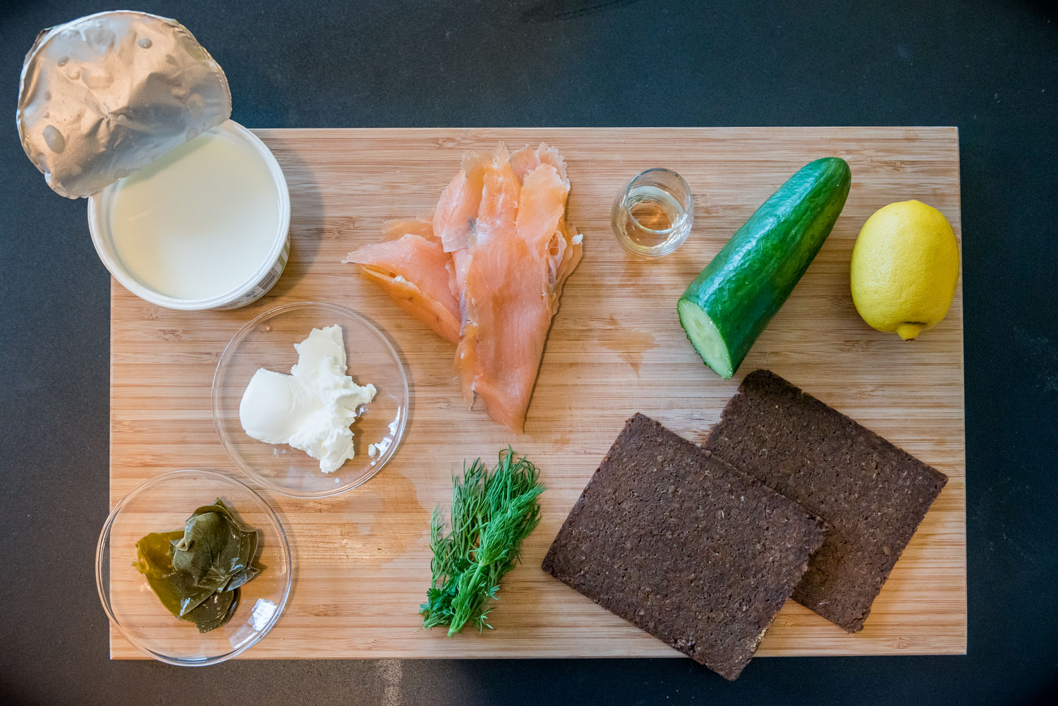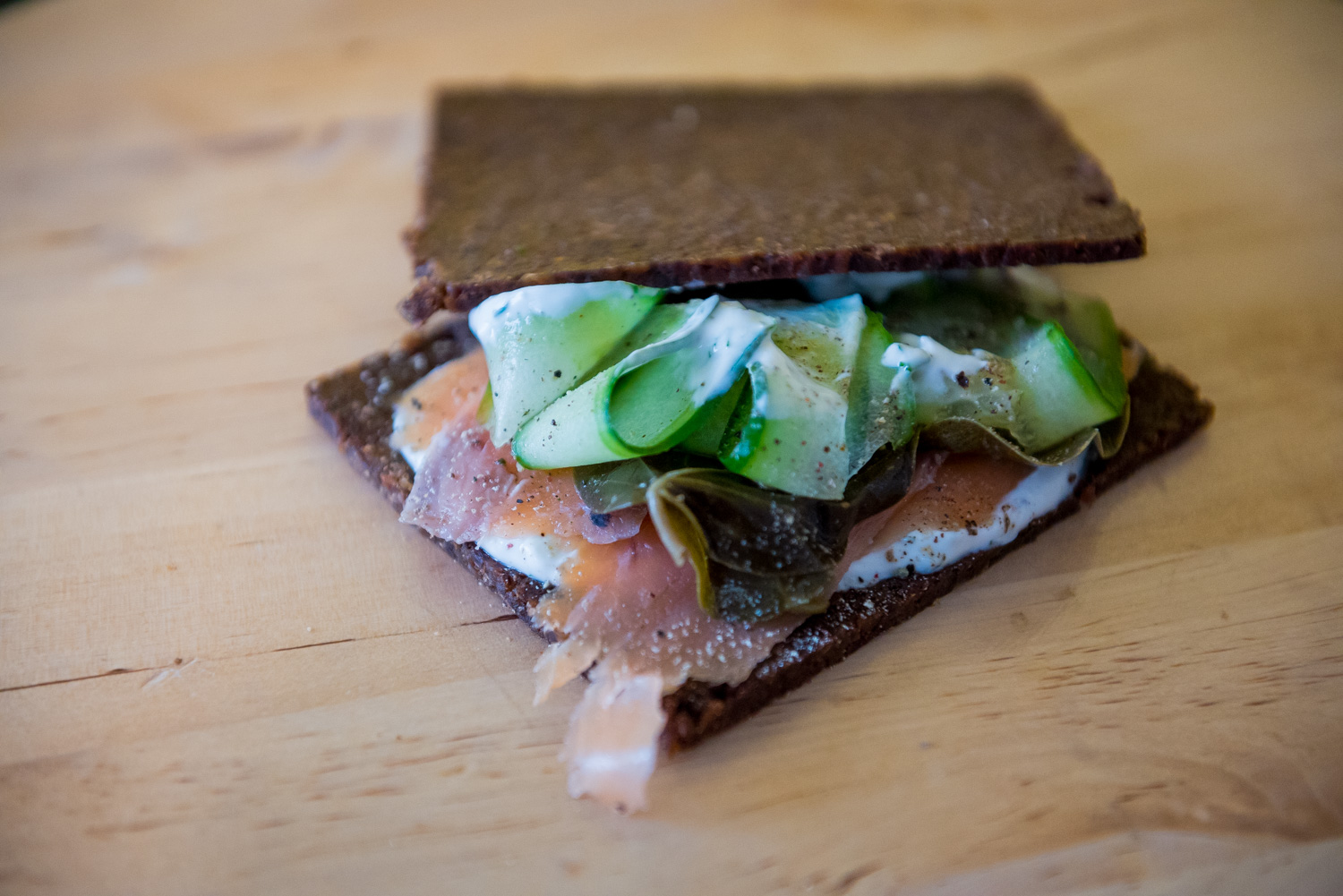 Για τη sour cream, βάζουμε σε ένα μπολάκι ένα κεσεδάκι στραγγιστό γιαούρτι, 1 κουτάλια του γλυκού τυρί κρέμα και προσθέτουμε αλάτι, πιπέρι, λίγο ξύδι, λίγο λεμόνι και μια φουντίτσα άνηθο και ανακατεύουμε. Έπειτα, προχωράμε στο στήσιμο του σάντουιτς με την εξής σειρά: 1 φέτα ψωμί Pumpernickel αλειμμένη με sour cream και πασπαλισμένη με ξύσμα λεμονιού, όσες φέτες καπνιστού σολομού θέλουμε, φύλλα κάπαρης, αγγούρι κομμένο με peeler (για να μη σου φεύγει δεξιά κι αριστερά), αλάτι και φρεσκοτριμμένο πιπέρι πάνω στο αγγούρι μας και κλείνουμε το σάντουιτς με άλλη μια φέτα Pumpernickel.
