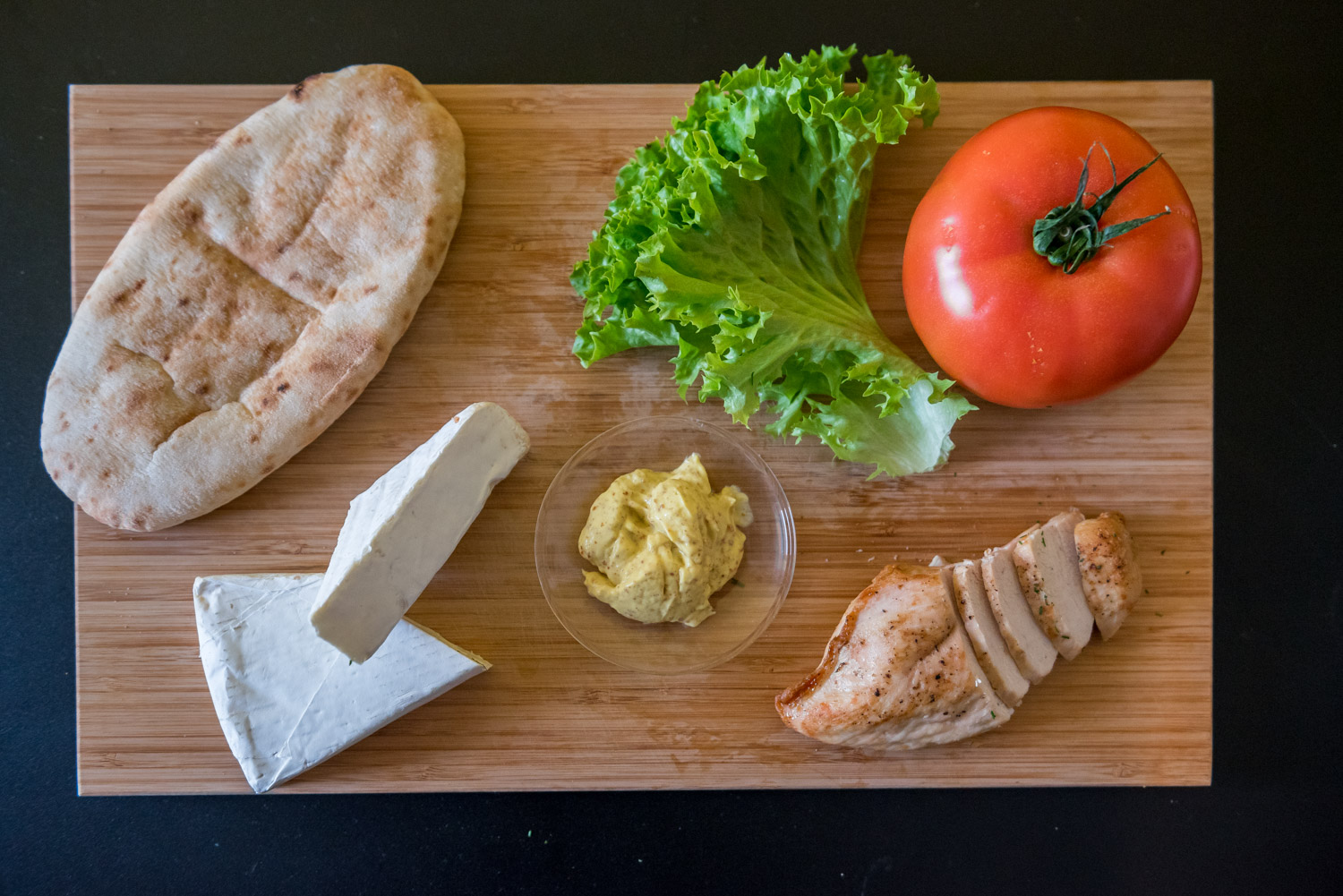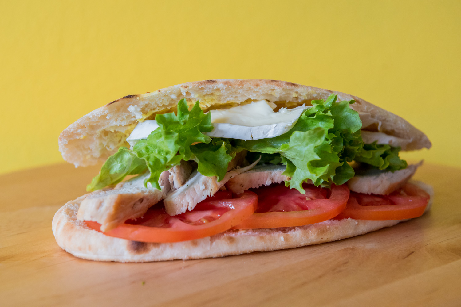 Σε ένα τηγάνι σοτάρουμε το στήθος κοτόπουλο μέχρι να πάρει χρώμα από όλες τις πλευρές και έπειτα το ψήνουμε σε ένα ταψάκι με λίγο νερό στο φούρνο στους 180 βαθμούς για 20 λεπτά. Για να βεβαιωθούμε ότι είναι έτοιμο το κοτόπουλό μας, το κόβουμε ελαφρώς με ένα μαχαίρι στο κέντρο του και τσεκάρουμε το χρώμα του. Έπειτα στήνουμε το σάντουιτς με την εξής σειρά: κυπριακή πίτα κομμένη σαν φωλιά και αλειμμένη στο εσωτερικό της με μουστάρδα Dijonnaise, ντομάτα, κοτόπουλο κομμένο σε λεπτές φέτες, πράσινη λόλα και τυρί Brie.