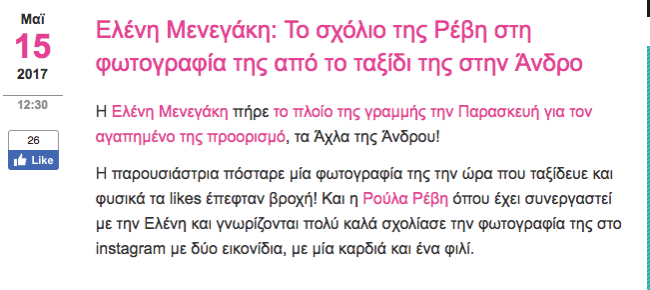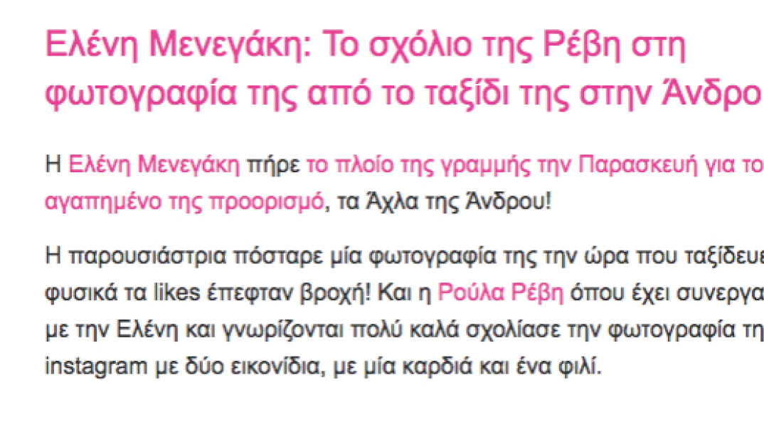 Δυο ΟΛΟΚΛΗΡΑ emoticons μιας φωτογράφου προς μια παρουσιάστρια στάθηκαν ικανά για κάποιον συντάκτη να γράψει έξι γραμμές κείμενο, να βρει τη φωτό της μενεγάκη, να την κροπάρει, να της βάλει ροζ πλαίσιο, να την ανεβάσει, να λινκάρει μέσα άλλες αναφορές στο ταξίδι στην Άνδρο (υπήρχαν, εννοείται), να κάνει σκρίνσοτ το ποστ της Μενεγάκη και ΜΕΓΕΘΥΜΕΝΟ σκρινσοτ το comment της Ρέβη.