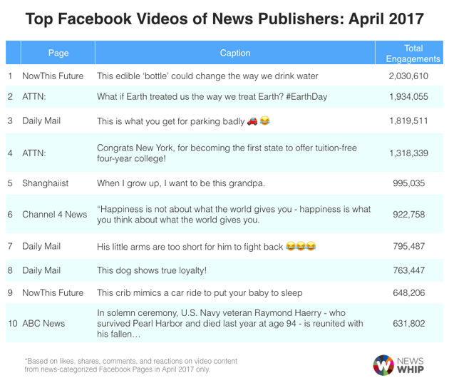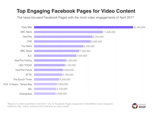 To NewsWhip αναζήτησε τις σελίδες (pages) δημοφιλών μέσων ενημέρωσης στο Facebook, προκειμένου να διαπιστώσει ποιο από αυτά κατάφερε να επιτύχει το μεγαλύτερο engagement σε βίντεο για τον Απρίλιο του τρέχοντος έτους. Με άλλα λόγια, η σελίδα ποιου μέσου συγκέντρωσε τα περισσότερα reactions, shares και comments.
