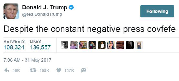 Ο λόγος για το «covfefe», το οποίο γράφτηκε από τον αμερικανό πρόεδρο σε ανάρτησή του στο Twitter και που προφανώς δεν υπάρχει σε κανένα λεξιλόγιο.