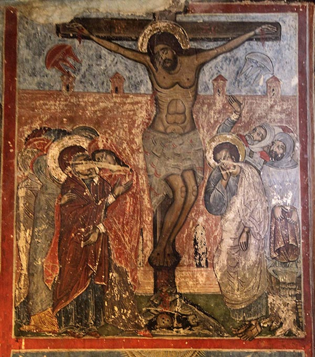 Στη Γεωργία έχει στραφεί τις τελευταίες εβδομάδες το ενδιαφέρον των ερευνητών UFO. Την προσοχή τους τράβηξε μια νωπογραφία του 17ου αι. με τον Εσταυρωμένο και συγκεκριμένα το αντικείμενο που βρίσκεται στα δεξιά της σύνθεσης. Το μοτίβο επαναλαμβάνεται και στα αριστερά της νωπογραφίας.