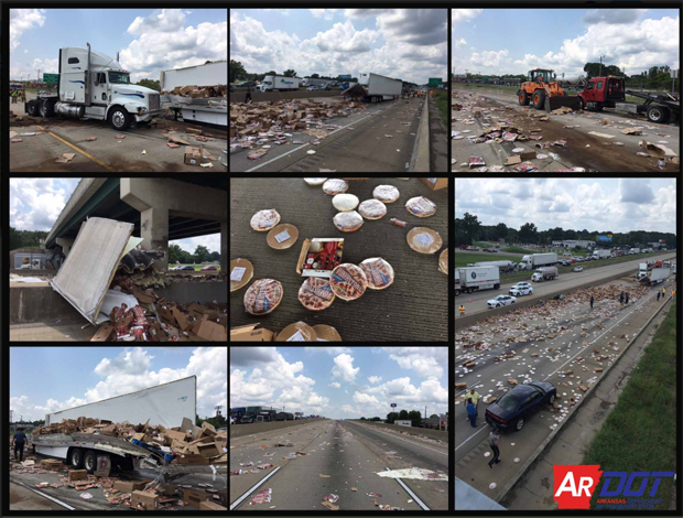 Όλα ξεκίνησαν όταν το πάνω μέρος της νταλίκας βρήκε σε γέφυρα, με αποτέλεσμα το κοντέινερ να γίνει κομμάτια και ο δρόμος να κατακλυστεί από τις συσκευασίες. Το απίστευτο συμβάν εκτυλίχθηκε την Τετάρτη νότια της πρωτεύουσας Λιτλ Ροκ. Για τον καθαρισμό του οδοστρώματος επιστρατεύτηκαν μπουλντόζες.