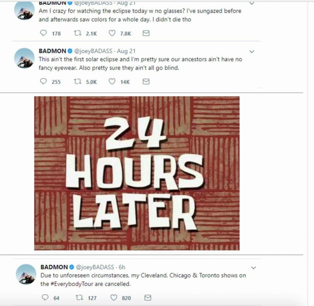 Ο ράπερ, το τελευταίο άλμπουμ του οποίου τιτλοφορείται «All-Amerikkkan Bada$$» και πραγματεύεται θέματα που αντιμετωπίζουν οι ΗΠΑ όπως ο ρατσισμός ή οι μαζικές φυλακίσεις, δεν ήταν ο μόνος τολμηρός που κοίταξε την έκλειψη ηλίου με γυμνά μάτια.