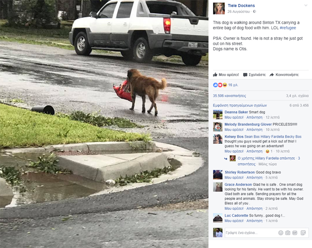 Συγκινητική αλλά και ενθαρρυντική είναι η φωτογραφία που δείχνει έναν σκύλο να κυκλοφορεί μόνος στο Τέξας εν μέσω του τυφώνα, κρατώντας με το στόμα του τη σακούλα με την τροφή του.