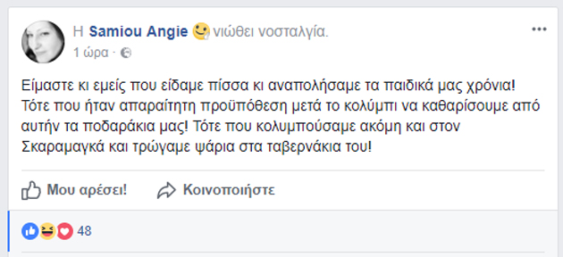 Σύμφωνα με την ανάρτησή της στο facebook: «Είμαστε κι εμείς που είδαμε πίσσα κι αναπολήσαμε τα παιδικά μας χρόνια! Τότε που ήταν απαραίτητη προϋπόθεση μετά το κολύμπι να καθαρίσουμε από αυτήν τα ποδαράκια μας! Τότε που κολυμπούσαμε ακόμη και στον Σκαραμαγκά και τρώγαμε ψάρια στα ταβερνάκια του!».