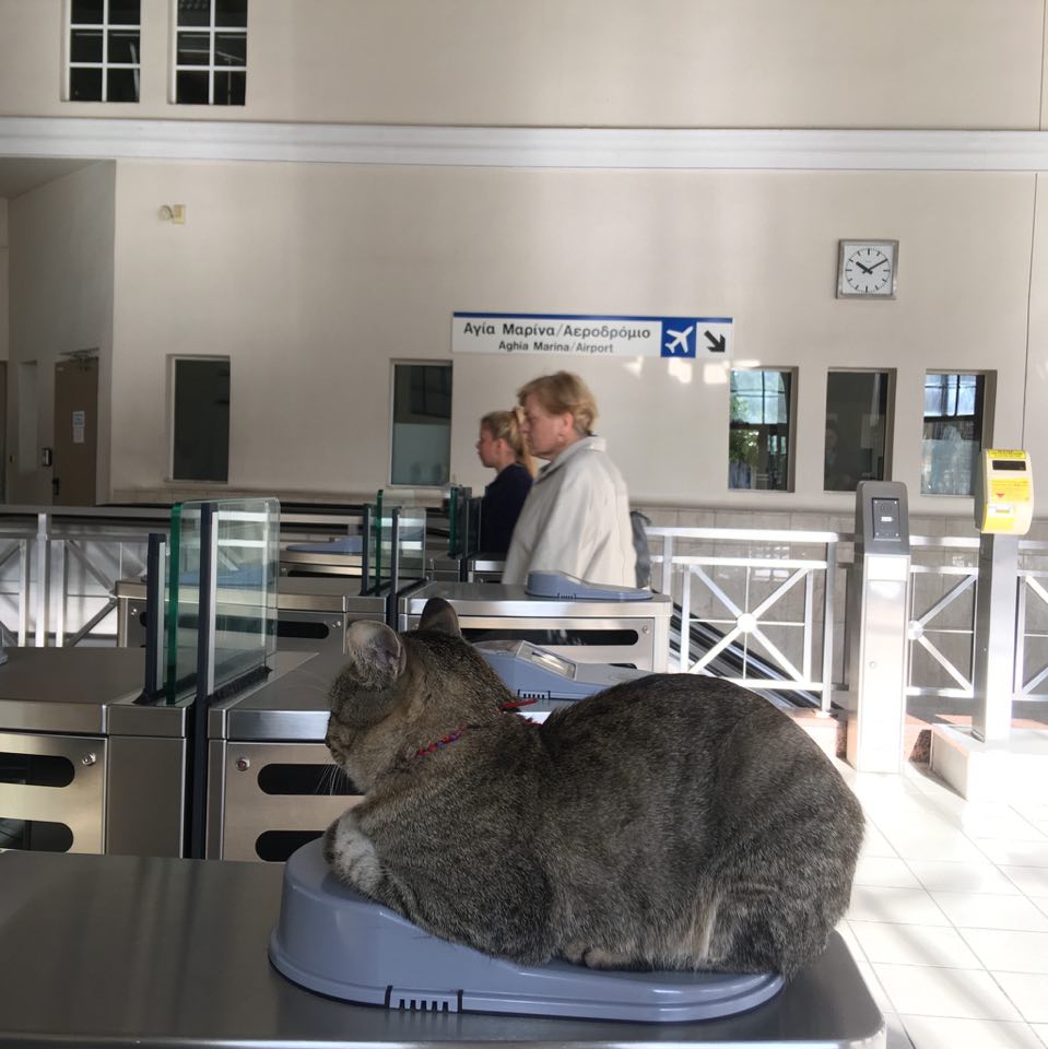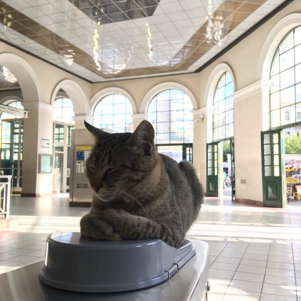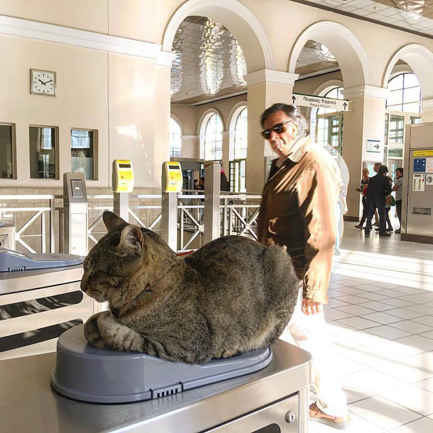 Τις τελευταίες εβδομάδες μια γάτα εμφανίζεται όλο και πιο συχνά στα social media, καθώς έχει επιλέξει ένα από τα μηχανήματα ακύρωσης ηλεκτρονικού εισιτηρίου (τουρνικέ) του ΗΣΑΠ στο Μοναστηράκι για να ξεκουράζεται, να «μαζεύει» ήλιο και να «εισπράττει» μερικά χάδια από μικρούς και μεγάλους.