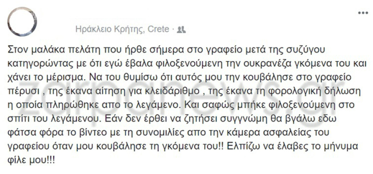 Ο παντρεμένος Κρητικός είχε τακτοποιήσει τις υποθέσεις του. Είχε φροντίσει να δηλώσει ως «φιλοξενούμενη» στη συζυγική εστία την Ουκρανή ερωμένη του, να την πάει στον λογιστή του για να της ανοίξει κλειδάριθμο και να ετοιμάσει τη φορολογική της δήλωση (την οποία και πλήρωσε βεβαίως, βεβαίως).