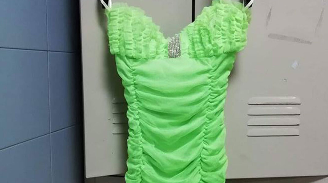 Ένα λαχανί φωσφορούχο φόρεμα από την εποχή της disco- προφανώς-, με τον απαραίτητο όπως φαίνεται λουσάτο στολισμό στο κέντρο, φαίνεται πως βρέθηκε μεταξύ των ρούχων που έχουν σταλεί στους πληγέντες στην Ανατολική Αττική.