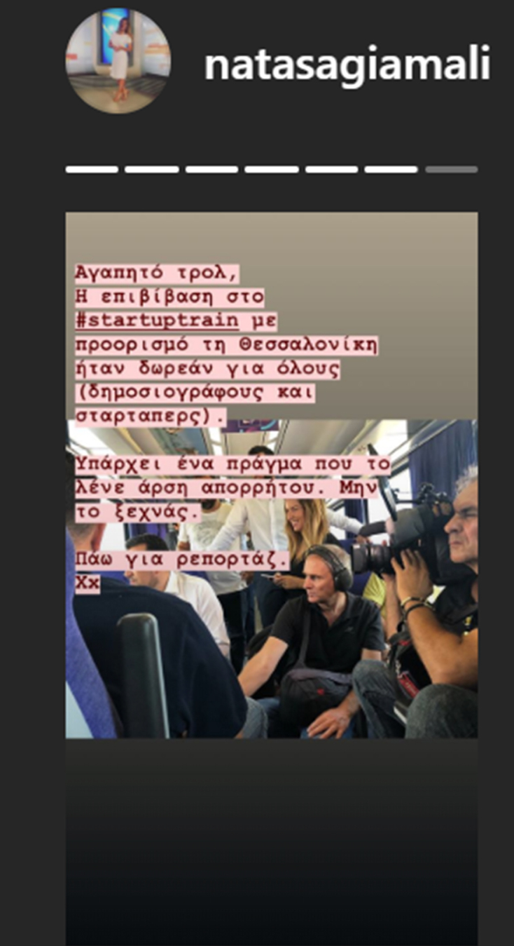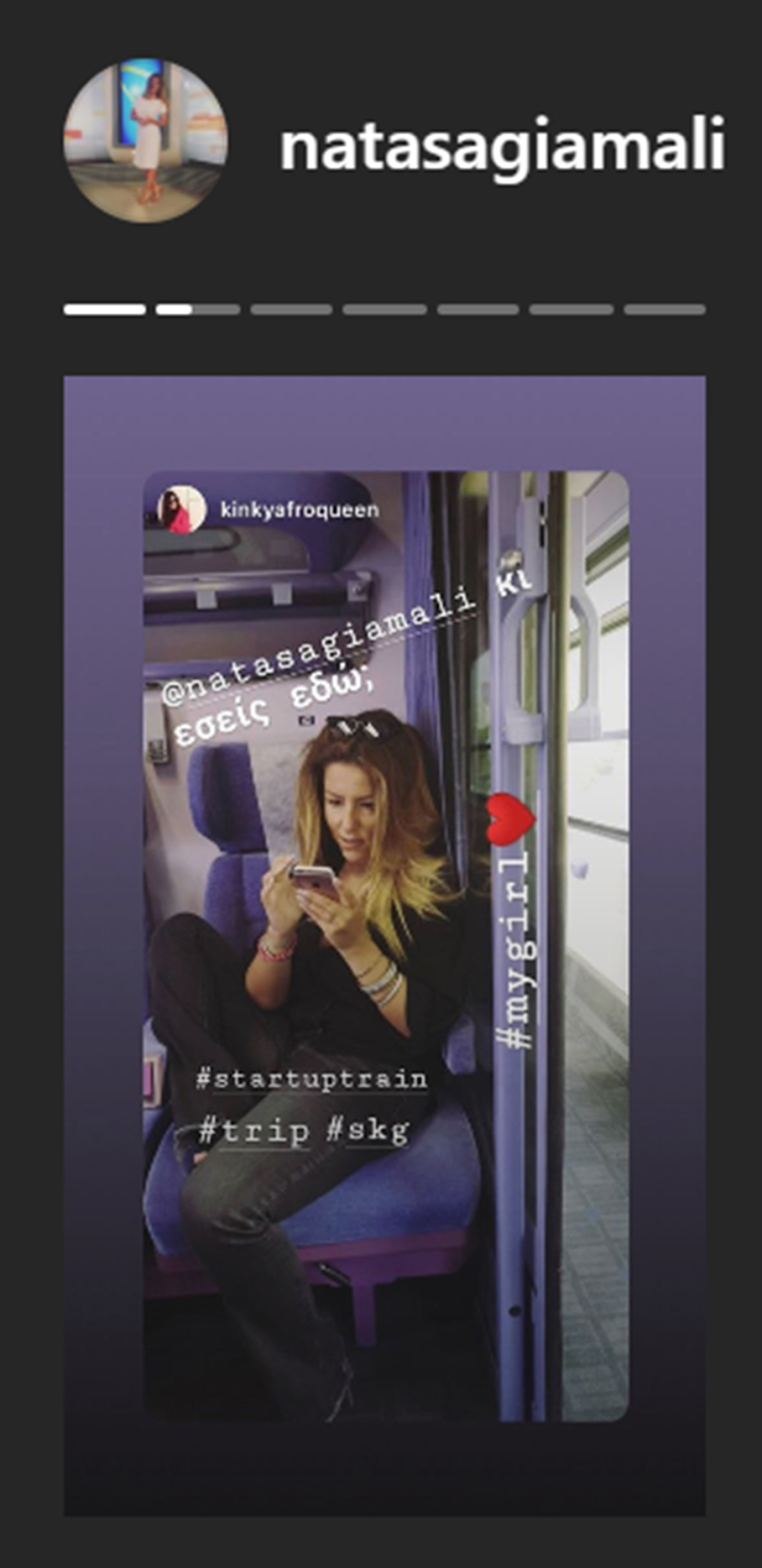 Η δημοσιογράφος Αναστασία Γιάμαλη ανέβασε στο λογαριασμό της στο Instagram φωτογραφίες από τη δωρεάν μετακίνησή της με τρένο προς τη Θεσσαλονίκη για τα εγκαίνια της 83ης ΔΕΘ με σχόλιο: «Ζωάρα».