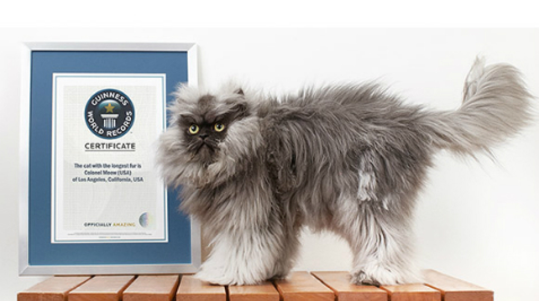 Μα ποιος ασχολείται με το Grumpy Cat που είναι πλέον γατικό καταστημένο; Ιδίως τώρα που εμφανίστηκε ο Συνταγματάρχης Μιάου, η γάτα με το μακρύτερο τρίχωμα στον κόσμο; Πρόκειται για γάτο που ανήκει σε ζευγάρι Αμερικανών και προέρχεται από διασταύρωση γάτας Ιμαλαΐων με Περσική. Το τρίχωμα του φτάνει σε μήκος τα 22 εκατοστά και σύμφωνα με τα ρεκόρ Γκίνες, είναι ο γάτος με το μακρύτερο τρίχωμα στον πλανήτη. Σύμφωνα με την ιδιοκτήτρια έχει λογαριασμό στο Twitter και το Tumblr, δικό του σάιτ και θέλει να κατακτήσει τον κόσμο...Πριν βγάλετε τις μεζούρες, δείτε το βίντεο