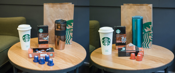 - Mια γαλλική πρέσα, ένα θερμός και μια κούπα από τα αγαπημένα μας Starbucks