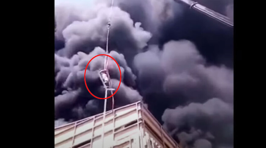 Τον γύρο των social media κάνει ο θεαματικός απεγκλωβισμός με γερανό ενός άνδρα από φλεγόμενο κτίριο.