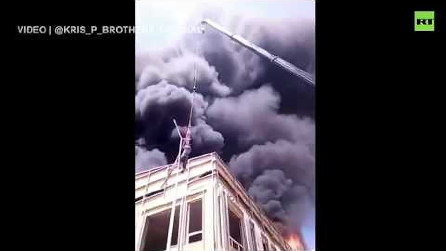Δεν είναι σκηνή από κινηματογραφική ταινία: Με... γερανό δραπέτευσε εγκλωβισμένος εργάτης σε φλεγόμενο κτίριο στο Καζακστάν.