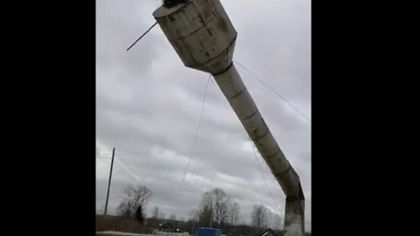 Όλα λάθος με κατεδάφιση στη Ρωσία, καθώς η παλιά δεξαμενή νερού έπεσε πάνω στο βανάκι των εργατών, καταστρέφοντάς το.