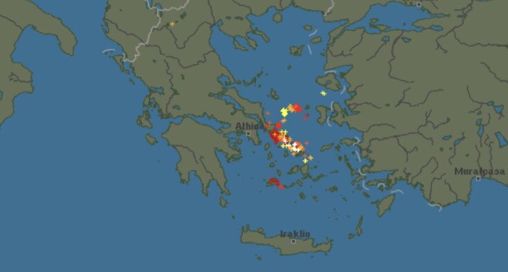 Έντονη είναι η κεραυνική δραστηριότητα που καταγράφεται από νωρίς το πρωί του Σαββάτου (26.8). Η «ξηρή καταιγίδα» φαίνεται ότι ευθύνεται για φωτιές που έχουν ξεσπάσει στη Βάρη, την ευρύτερη περιοχή του Μαραθώνα, αλλά και την Άνδρο.
