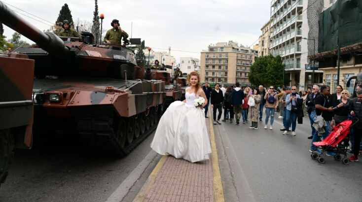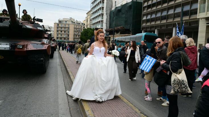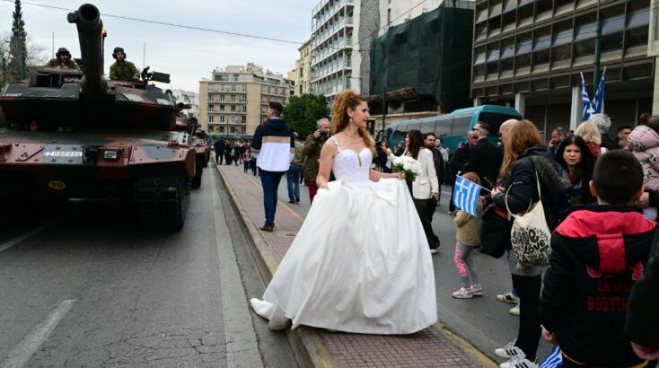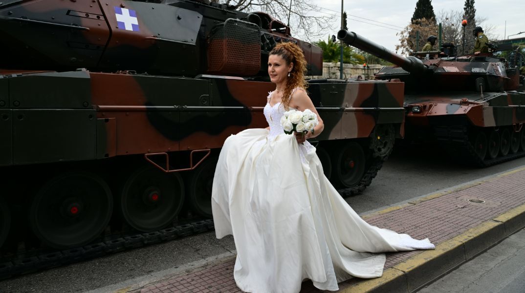 25η Μαρτίου: Νύφη με ανθοδέσμη στο χέρι πόζαρε μπροστά από τα άρματα