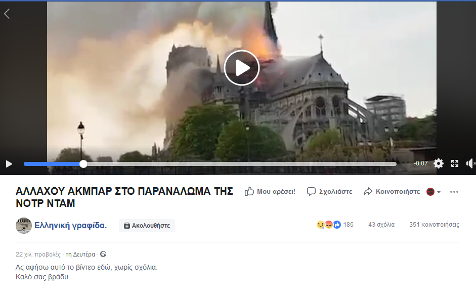 Στο βίντεο, που έχει ήδη δεκάδες χιλιάδες προβολές στο Facebook, βλέπουμε την Παναγία των Παρισίων να καίγεται, ενώ ακούμε ανθρώπους να φωνάζουν Allahu Akbar («Ο Αλλάχ είναι μεγάλος»). Μαζί με αυτές τις επικλήσεις ακούμε ταυτόχρονα συνομιλίες στα αραβικά σε χαμηλότερη ένταση. [πηγή]