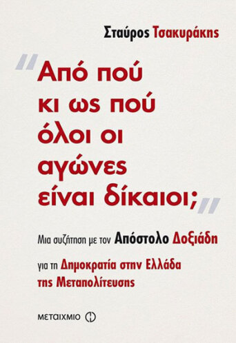 O Σταύρος Τσακυράκης, καθηγητής Συνταγµατικού Δικαίου στο Πανεπιστήµιο της Αθήνας, καλεσµένος της ελληνικής κοινότητας του Πανεπιστηµίου της Οξφόρδης, συζητά µε τον συγγραφέα Απόστολο Δοξιάδη για τη Δηµοκρατία στη Μεταπολίτευση. Μερικά από τα θέµατα που τους απασχολούν: • Είναι η αντίσταση στη δικτατορία µυθοποιηµένη; • Πώς µας καθόρισαν τα πρώτα µεταπολιτευτικά χρόνια; • Από πού κι ως πού όλοι οι αγώνες είναι δίκαιοι; Ο ρόλος του συνδικαλισµού στην ελληνική κοινωνία. • Τι είναι το κράτος; Είµαστε όλοι εµείς; • Η λειτουργία των ελληνικών πανεπιστηµίων, ο φοιτητικός συνδικαλισµός και η ίδρυση µη κρατικών πανεπιστηµίων. • Συγκρούεται η αρχή της ισότητας µε την ελευθερία; • Υπάρχει πρόβληµα ελευθερίας λόγου στην Ελλάδα; • Ποιος ο ρόλος της δικαιοσύνης στη σύγχρονη δηµοκρατία;