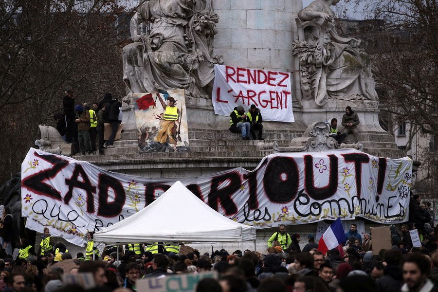 Διαδηλωτές, ορισμένοι από τους οποίους φορούσαν «κίτρινα γιλέκα», επιχείρησαν να πυρπολήσουν την πρόσοψη στα Ηλύσια Πεδία στο Παρίσι, σύμφωνα με δημοσιογράφους του Γαλλικού Πρακτορείου. Διαδηλωτές έβαλαν φωτιά σε έλατα που τοποθέτησαν μπροστά στην πρόσοψη αφού αφαίρεσαν πολλές προστατευτικές ξύλινες κατασκευές. Όπως μετέδωσε το Γαλλικό Πρακτορείο, ένα «κίτρινο γιλέκο» φεύγει από τα Ηλύσια Πεδία και λέει σε μια νεαρή γυναίκα που έρχεται από την αντίθετη κατεύθυνση: «Φεύγουμε, είμαστε εδώ από το πρωί». Εκείνη του απαντά: «Μην ανησυχείς, ερχόμαστε, είμαστε η αλλαγή της βάρδιας».