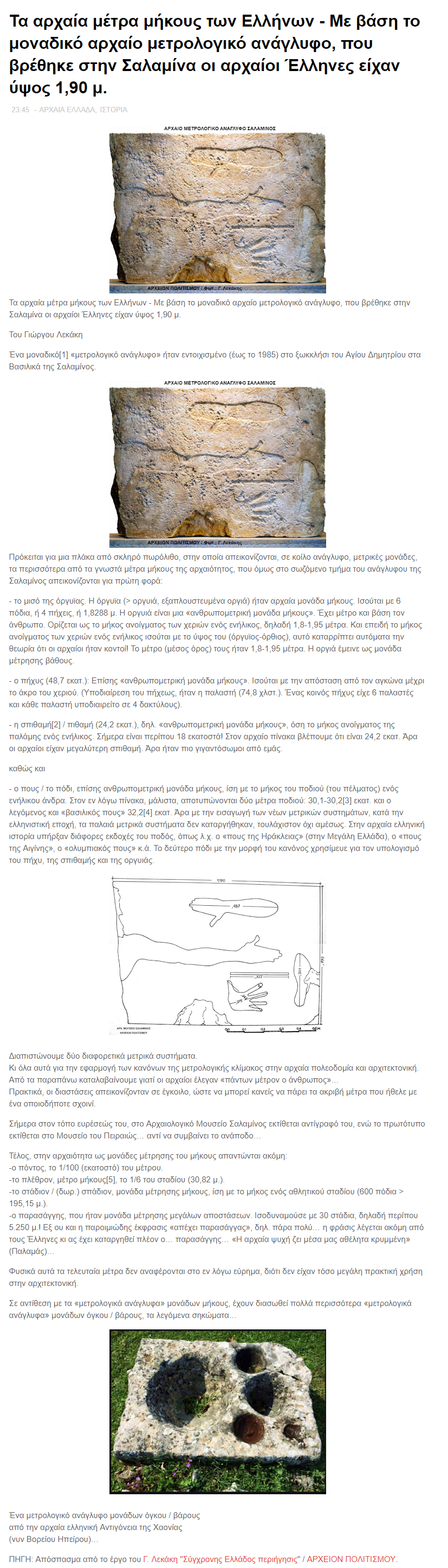 Σύμφωνα με την αρχαιολόγο Ιφιγένεια Δεκουλάκου, η οργυιά (δηλαδή το μήκος του ανοίγματος των χεριών) στο ανάγλυφο της Σαλαμίνας είναι 1,944 μέτρα (194,4 εκατοστά). Με την λογική των δημοσιευμάτων που εξετάζουμε σήμερα, το μέσο ύψος των αρχαίων Ελλήνων θα πρέπει να είναι 194,4 εκατοστά.