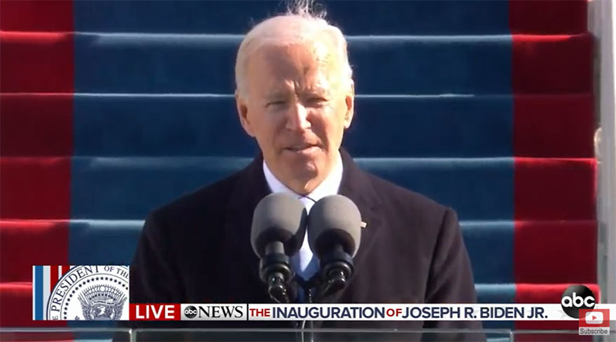 Ο Τζο Μπάιντεν δεν παρέλειψε να αφήσει αιχμές κατά του Ντόναλντ Τραμπ, επισημαίνοντας: «Αναδύεται ένας πολιτικός εξτρεμισμός, η λευκή υπεροχή, η εσωτερική τρομοκρατία που θα την αντιμετωπίσουμε και θα τη νικήσουμε». Μεταξύ άλλων ξεκαθάρισε: «Θα υπερασπιστώ το Σύνταγμα, τη Δημοκρατία και την Αμερική». Και απηύθυνε κάλεσμα προς όλους τους Αμερικανούς για «ενότητα όχι διχασμό» και για «φως όχι σκοτάδι».