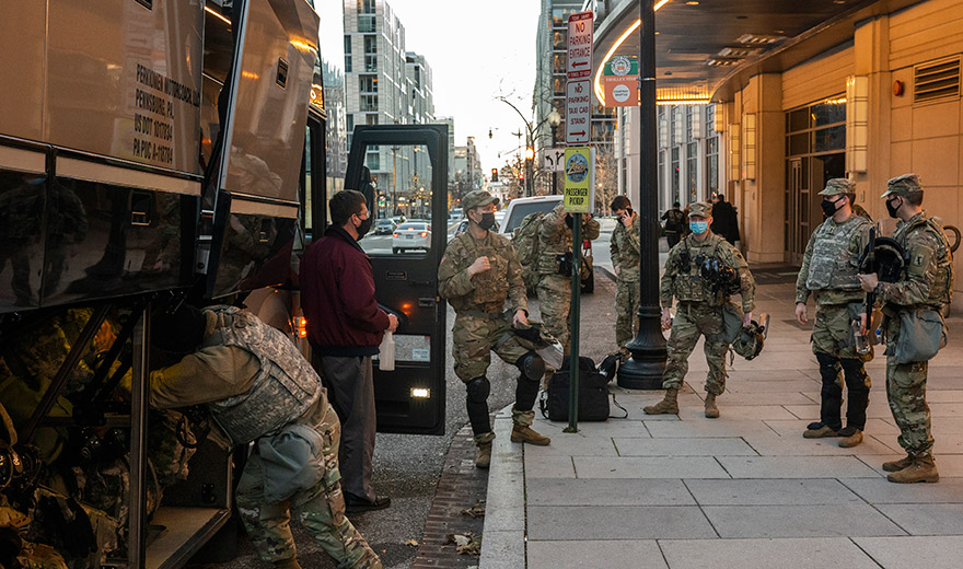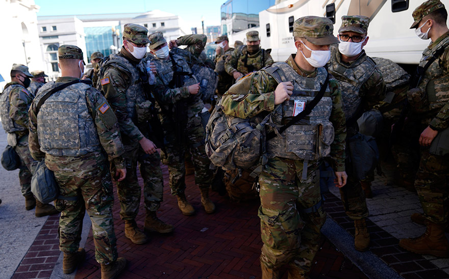Την Κυριακή, ο ασκών χρέη υπουργού Άμυνας Κρις Μίλερ είπε ότι το FBI βοηθά τον στρατό στον έλεγχο περισσότερων από 25.000 μελών της Εθνοφρουράς που έχουν αναπτυχθεί στην Ουάσινγκτον για να βοηθήσουν στην προστασία του Καπιτωλίου. Ο έλεγχος αυτός έχει ξεκινήσει από την περασμένη εβδομάδα. Το FBI εξετάζει επίσης αν κάποιος από τους ταραξίες που εισέβαλαν στο Καπιτώλιο στις 6 Ιανουαρίου υπηρετεί σε υπηρεσία ασφαλείας.