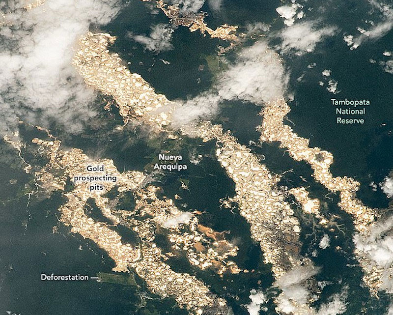 Τα «ποτάμια χρυσού» στο Περού που κατέγραψε αστροναύτης από τον Διεθνή Διαστημικό Σταθμό, δεν απεικονίζουν πραγματικό χρυσάφι, αλλά εγκαταλελειμμένα και ενεργά χρυσωρυχεία -αρκετά από τα οποία είναι παράνομα, καθώς χρυσοθήρες και μεταλλωρύχοι προσπαθούν να βρουν λίγο από το πολύτιμο μέταλλο. Όπως φαίνεται και στην εντυπωσιακή φωτογραφία της NASA, το σκούρο και ανοικτό πράσινο δίνει όλο και περισσότερο τη θέση του στο χρυσό.