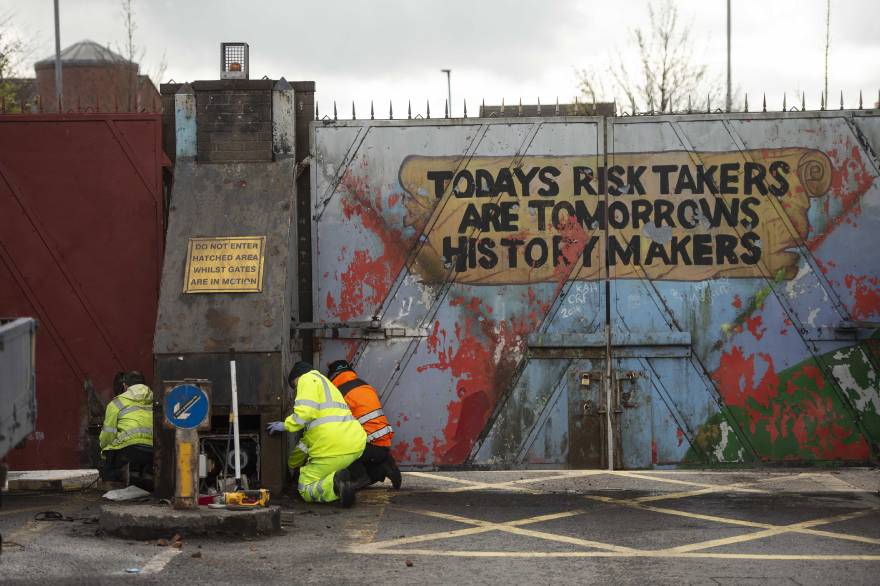 Διαδηλωτές ρίχνουν πέτρες εναντίον του μπλόκου που είναι γνωστό ως Τείχος της Ειρήνης κατηγορώντας το Λονδίνο για προδοσία