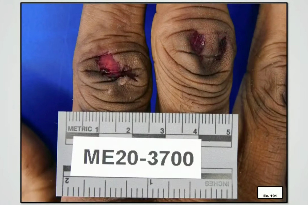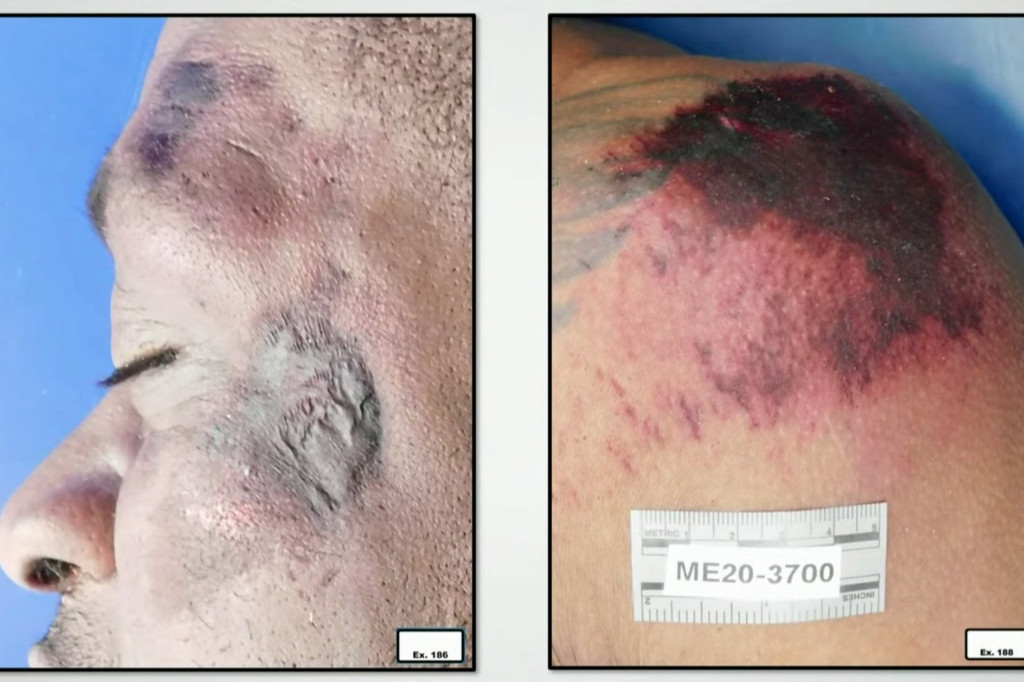 Εν τω μεταξύ νέες φωτογραφίες των τραυματισμών του Φλόιντ από την ιατροδικαστική εξέταση εμφανίστηκαν στο δικαστήριο για πρώτη φορά, δείχνοντας μώλωπες στην αριστερή πλευρά του προσώπου του, καθώς και τον ματωμένο ώμο του και τις αρθρώσεις των δακτύλων του επειδή είχε «καρφωθεί» στο έδαφος.