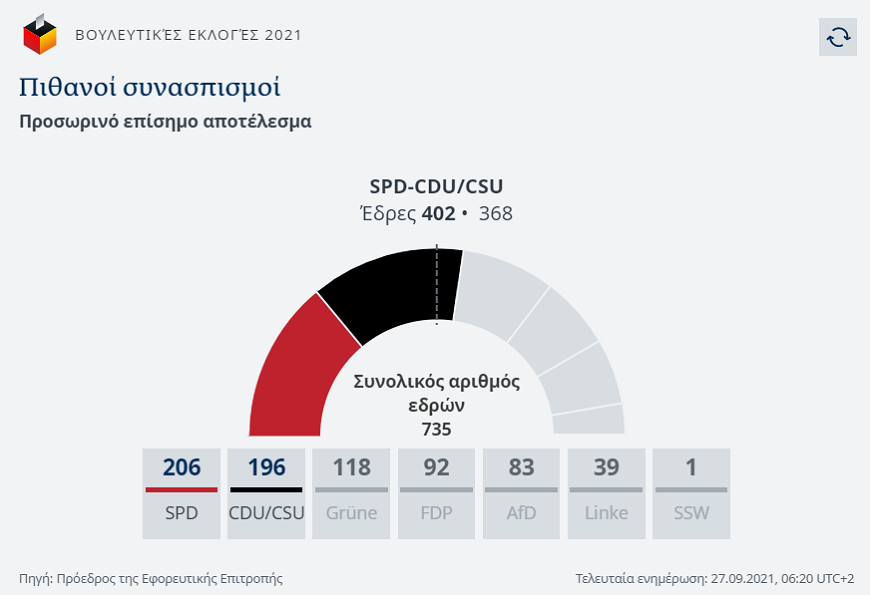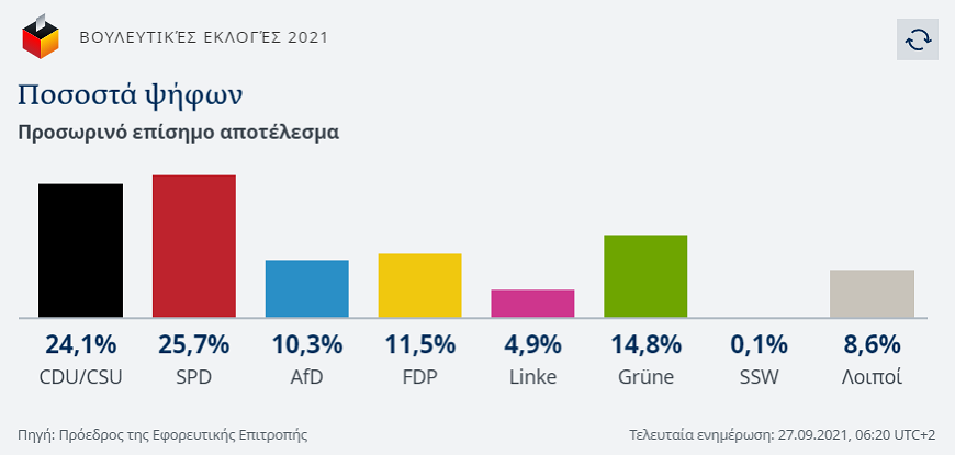 Το SPD συγκεντρώνει το 25,7% των ψήφων, το καλύτερο αποτέλεσμα που έχει καταγράψει εδώ και πολλά χρόνια, ενώ το CDU έλαβε 24,1% (-8,9% σε σύγκριση με τις προηγούμενες εκλογές), σημείωσαν με άλλα λόγια τη χειρότερη επίδοση στην ιστορία του, έπειτα από 16 χρόνια στην κυβέρνηση. Το δε CSU, το βαυαρικό αδελφό κόμμα του CDU, είδε το χειρότερο αποτέλεσμα από τις πρώτες εκλογές της Bundestag το 1949, αναφέρει η εφημερίδα Tagesspiegel, έχοντας κερδίσει μόλις 31,7 % σύμφωνα με τα προκαταρκτικά αποτελέσματα.