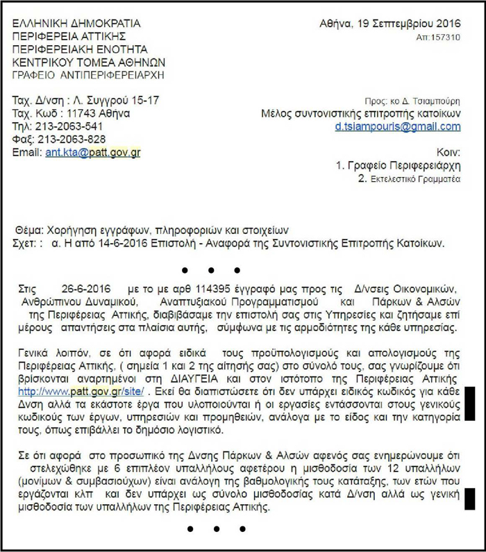 Απάντηση της Περιφέρειας σε αίτημα της Επιτροπής Κατοίκων που ομολογεί ότι δεν υπάρχει προϋπολογισμός ανά διεύθυνση ούτε για τα έργα ούτε για το προσωπικό. Ολα μπαίνουν σε ένα συνολικό καλάθι με αποτέλεσμα την αδιαφάνεια και την κατά συνέπεια έλλειψη δυνατότητας και οργάνωσης, παρακολούθησης και ελέγχου